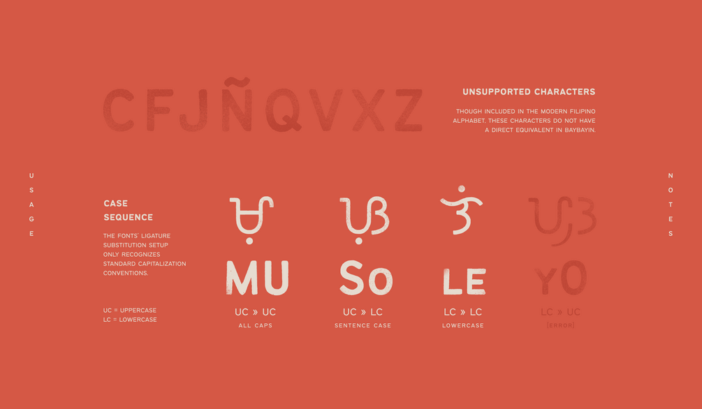 Ang Bantayog typeface ay ibinatay sa magaspang na mga titik na nakalilok sa mga panandang pangkasaysayan upang isalaysay ang mga makabuluhang pangyayari at búhay ng mga pambansang bayani. Isa ang Baybayin sa mga katutubong sistema ng pagsulat sa Pilipinas.